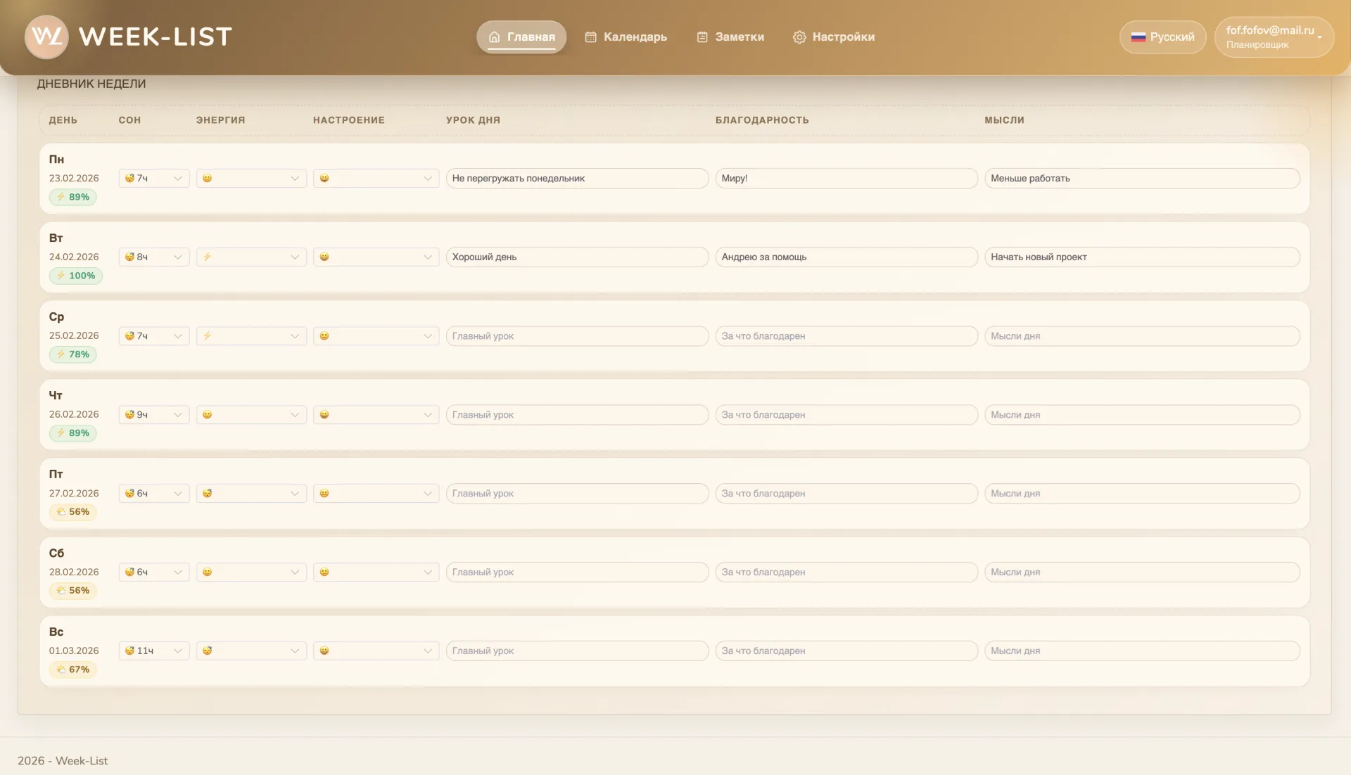 Высокая продуктивность невозможна без понимания собственного состояния. Week-List помогает учитывать энергию и настроение при планировании, чтобы неделя оставалась устойчивой.